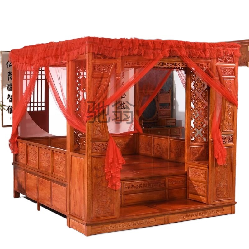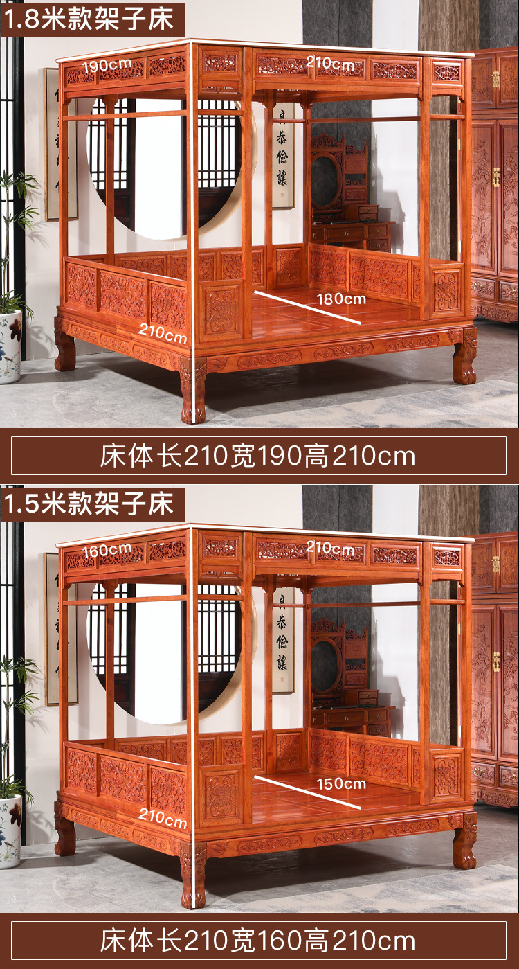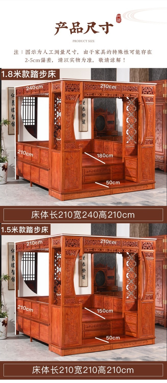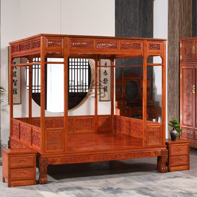 这款床的设计灵感来源于古代宫廷的家具风格,床架线条流畅,结构稳固,每一个细节都经过精心雕琢,展现出宫廷家具的精致与奢华。床头的拔步设计,既增加了床的整体高度,又使得整个床看起来更加大气磅礴。而床尾的踏步设计,则方便人们上下床,同时也为床的整体造型增添了一份别致。